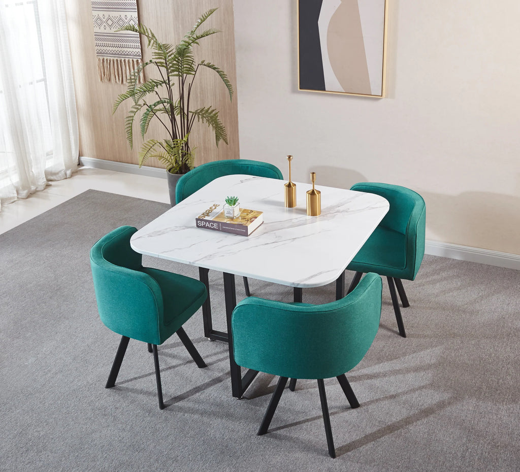 Welcome luxury into your dining area with this exquisite set. Featuring a White Marble top, and a sturdy black metal... Welcome luxury into your dining area with this exquisite set. Featuring a White Marble top, and a sturdy black metal base, this table lends your space an upscale feel. Upholstered in blue, black, and green leatherette, the chairs add a touch of modern sophistication. Generous in size, this set provides remarkable comfort and style. View more