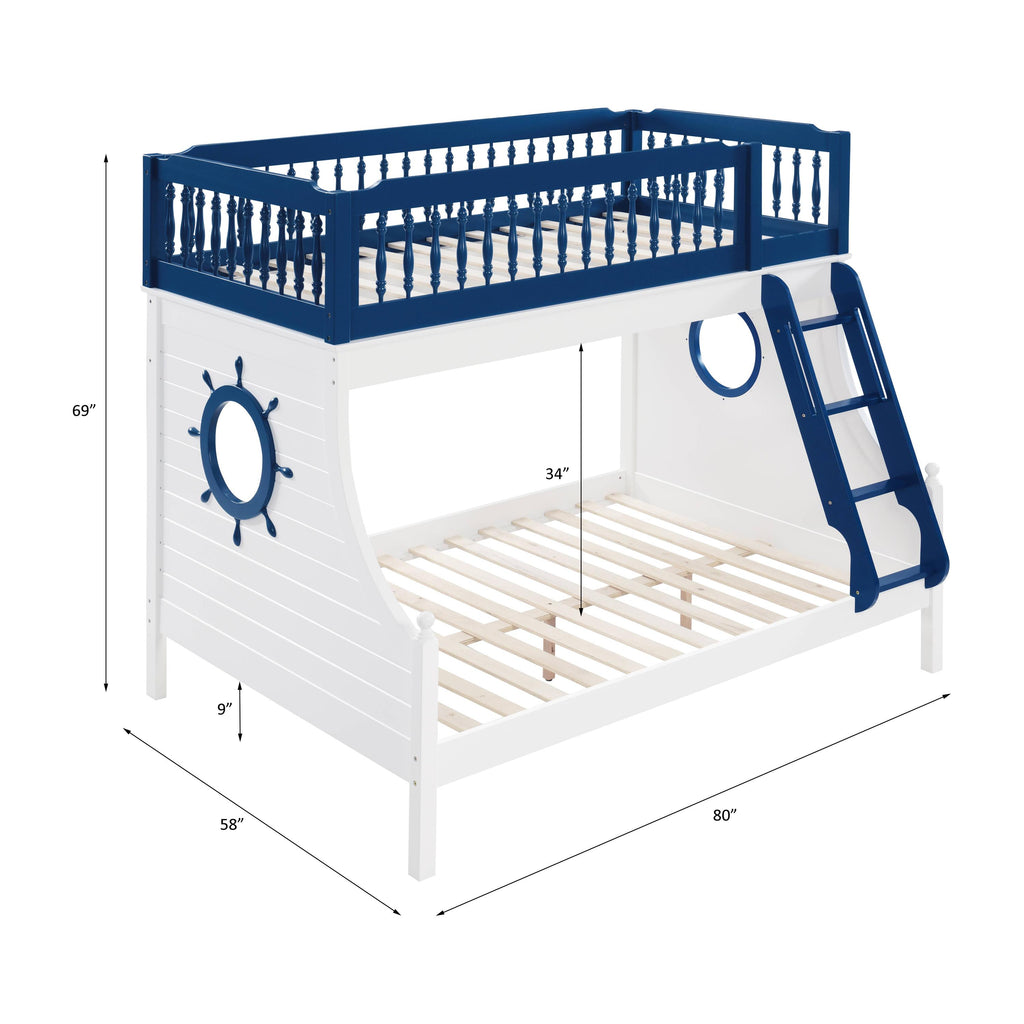 Bring joy to your little sailor's face with the Farah collection. The bunk bed features twin over full beds in... Bring joy to your little sailor's face with the Farah collection. The bunk bed features twin over full beds in a warm oak and white finish, easy access guardrail with decorative turned spindles, right facing built-in ladder, supporting slat system and decorative finials . Any children will love the ship wheel design on both walls, make bedtime feel like playtime. View more
