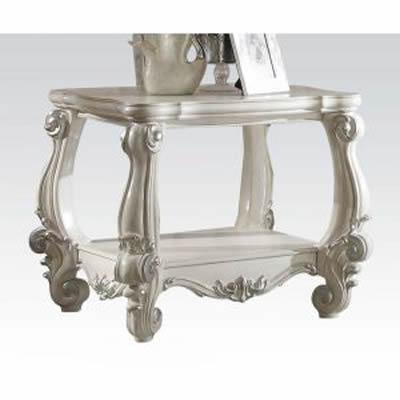 • Scrolled legs and shelf apron: Poly resin ornamental decor in bone white with silver contrast finish
