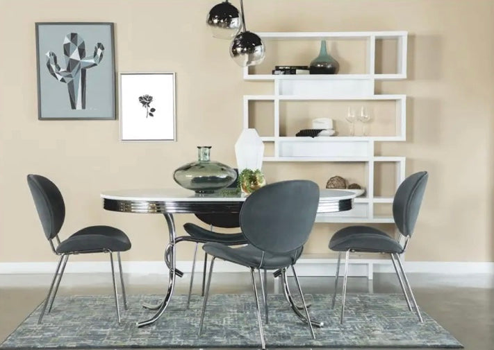 Slide these mid century modern side chairs up to a dining table for a vintage flair. Wrapped in a smooth,... Slide these mid century modern side chairs up to a dining table for a vintage flair. Wrapped in a smooth, soft-to-the-touch grey fabric, each chair is designed to complement whatever color palette your kitchen or dining space has. Padded oval-shaped round backs and seats curve gently at the edges, offering a warm embrace. In addition, slim rod-like metal legs in a brilliant chrome finish flare outward, presenting a charming silhouette and graceful aesthetic. Grab two sets to complete an entire dining room ensemble or a pair to nest aside a cafe size table. View more