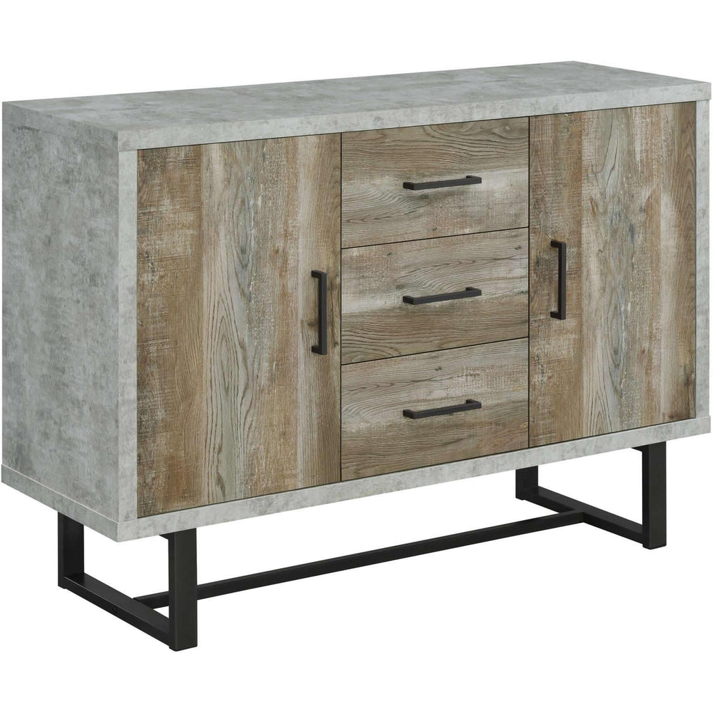 • Distressed weathered oak finish on the cabinet front pairs well with the faux cement frame