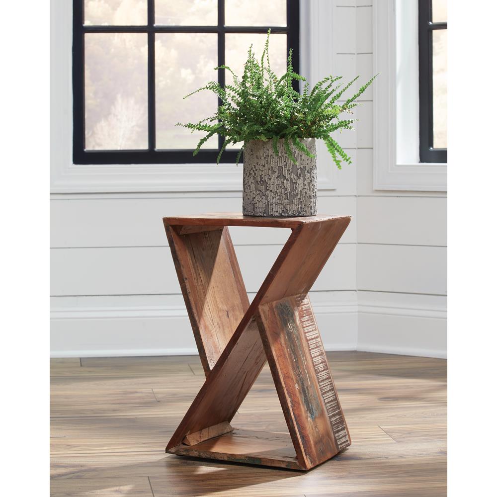 • Reclaimed wood side table showcasing a bold geometric hourglass-inspired design