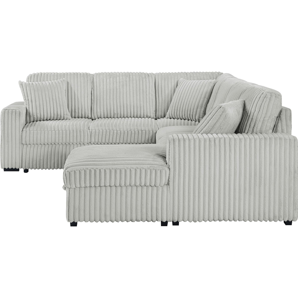 • Soft grey corduroy upholstery complements any interior style