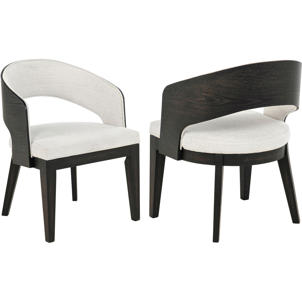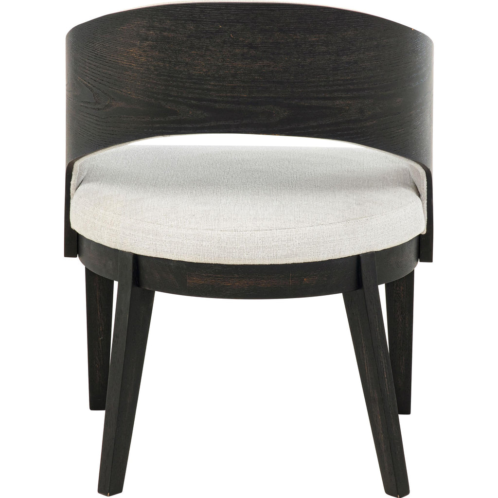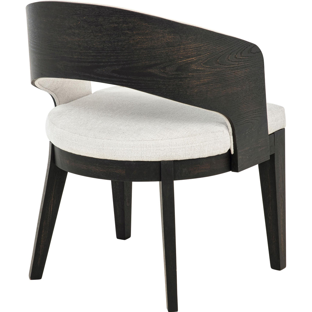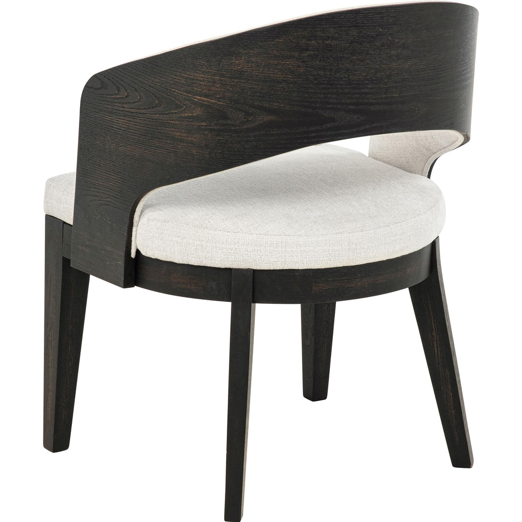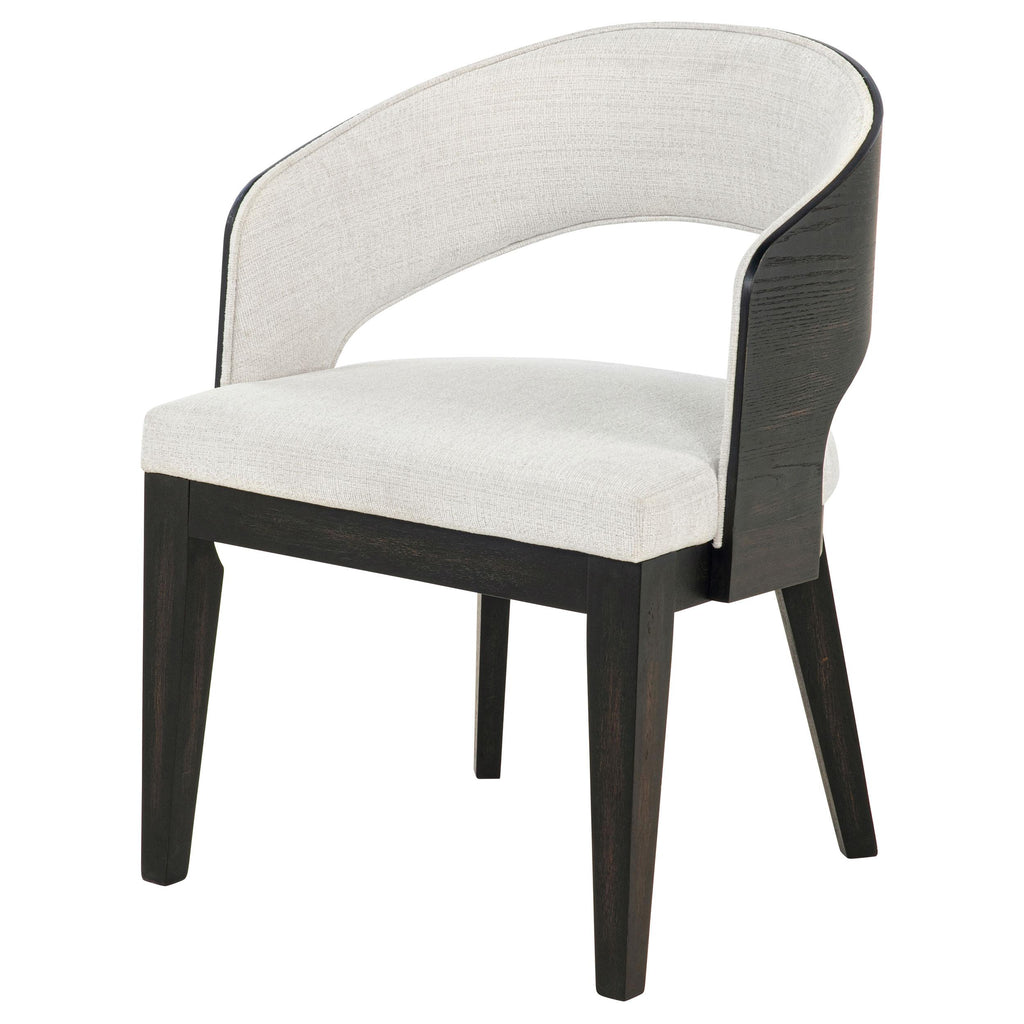Every curve of this upholstered dining arm chair is a gesture of quiet sophistication. Its sculpted frame, finished in a... Every curve of this upholstered dining arm chair is a gesture of quiet sophistication. Its sculpted frame, finished in a deep burnished black, cradles a generously cushioned seat and softly wrapped backrest in creamy fabric. The open barrel design invites relaxed posture, while the smooth sweep of the arms lends an effortless sense of grace. Perfect for gathering, lingering, and savoring, this chair brings poetry to the table. View more