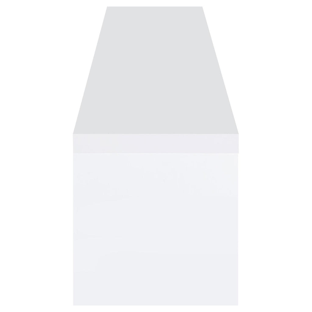 • Sleek, modern TV stand with pristine glossy white finish and clear glass accents