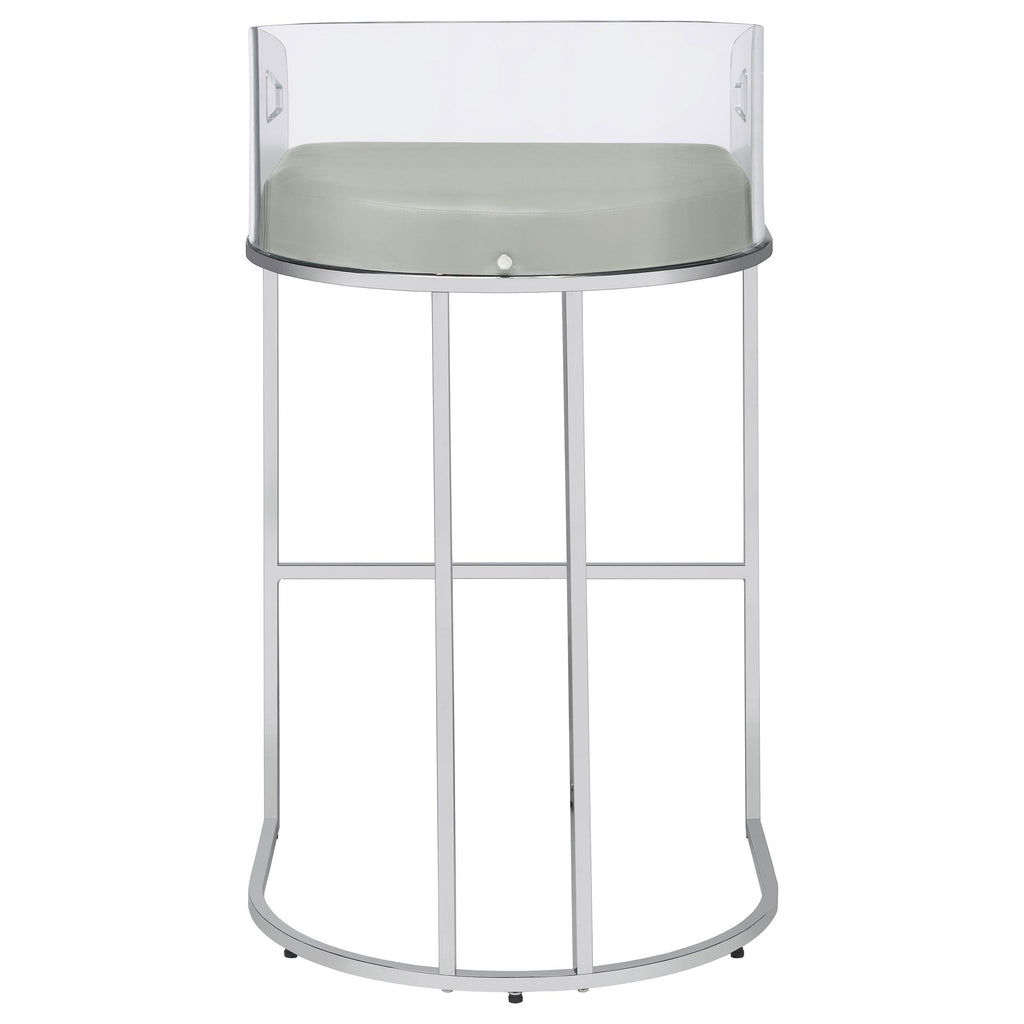 • Slim metal legs in a lustrous chrome finish and a base shape that mimics the rounded acrylic backrest provide support