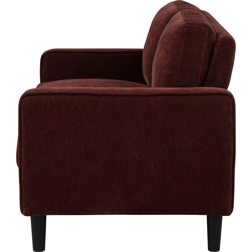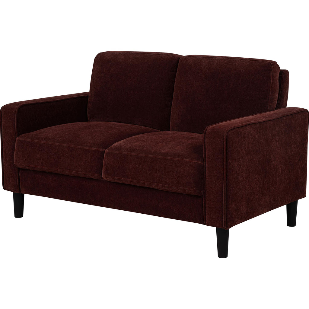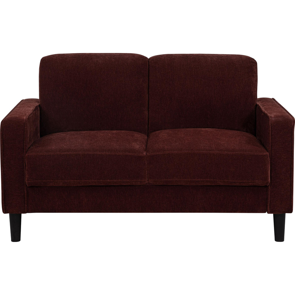 • Loveseat in rust fabric offers a compact two-seat design with clean structure