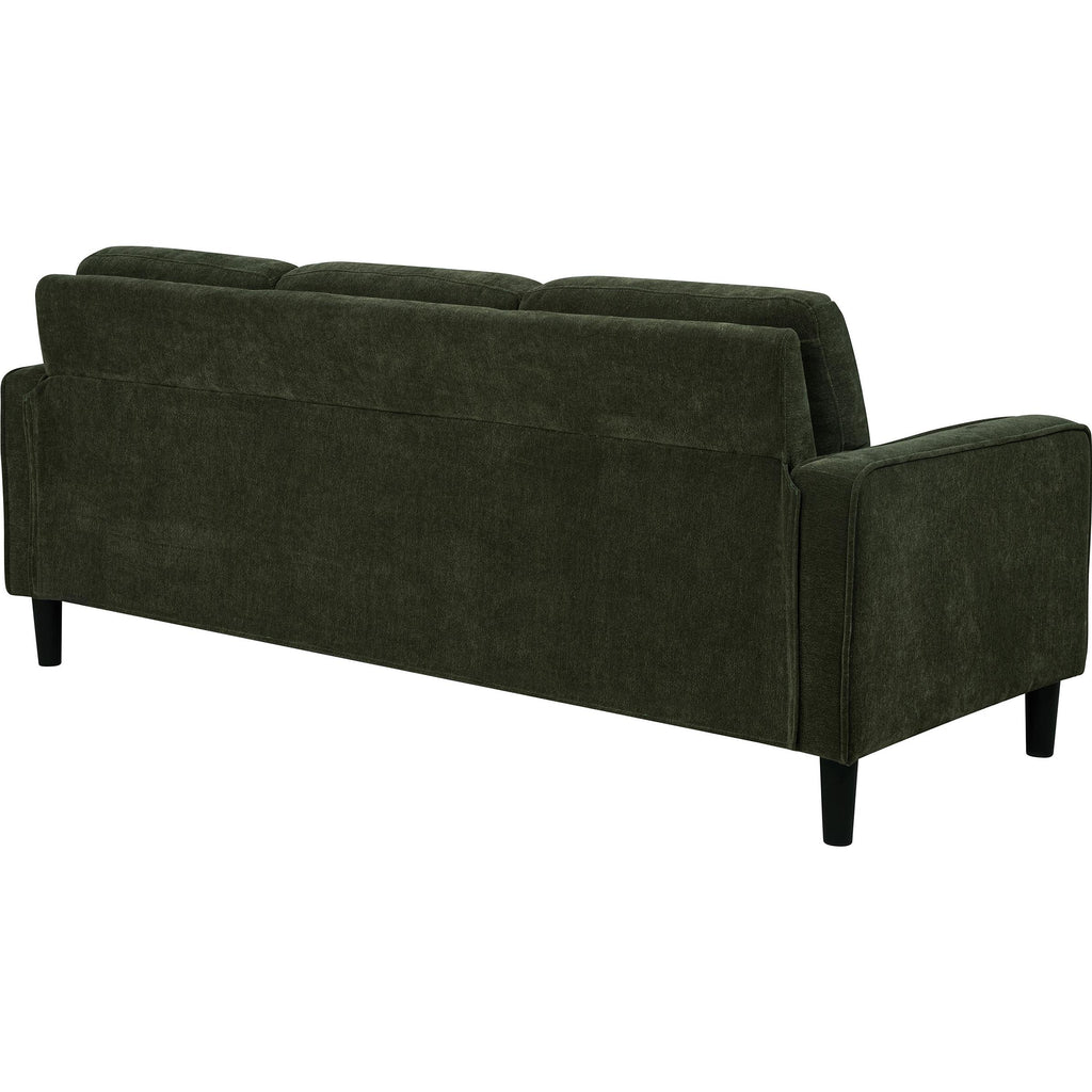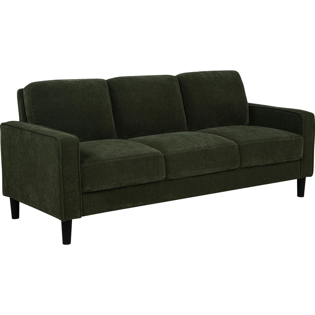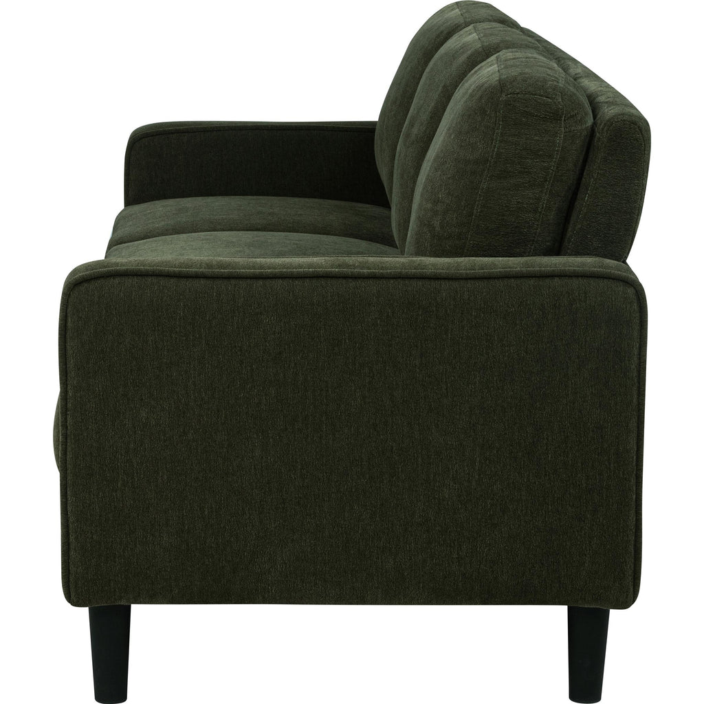• Sofa in matcha green fabric features a clean-lined silhouette with modern visual softness