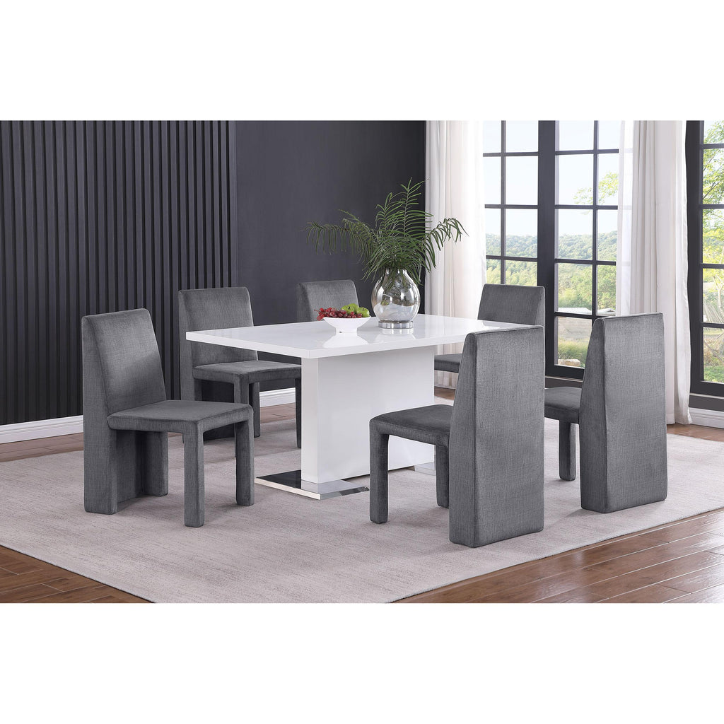• Deep grey upholstery has a slight sheen and soft touch for inviting style at a dining table