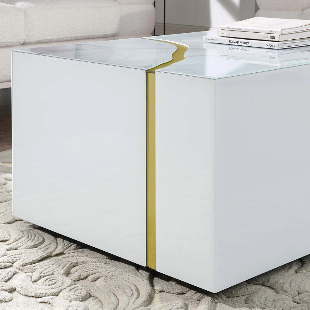 Elevate your living space with this sleek and contemporary coffee table, featuring a printed marble top in white. Combining the... Elevate your living space with this sleek and contemporary coffee table, featuring a printed marble top in white. Combining the elegance of marble with the durability of MDF and glass, this table offers both style and function. Its spacious 47.2" length and 27.6" depth make it the perfect centerpiece for any room. The table is fully assembled, allowing you to enjoy its beauty immediately without the hassle of assembly. View more