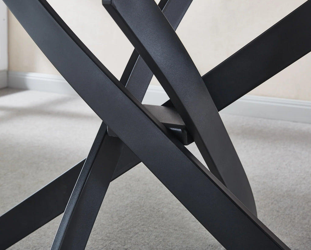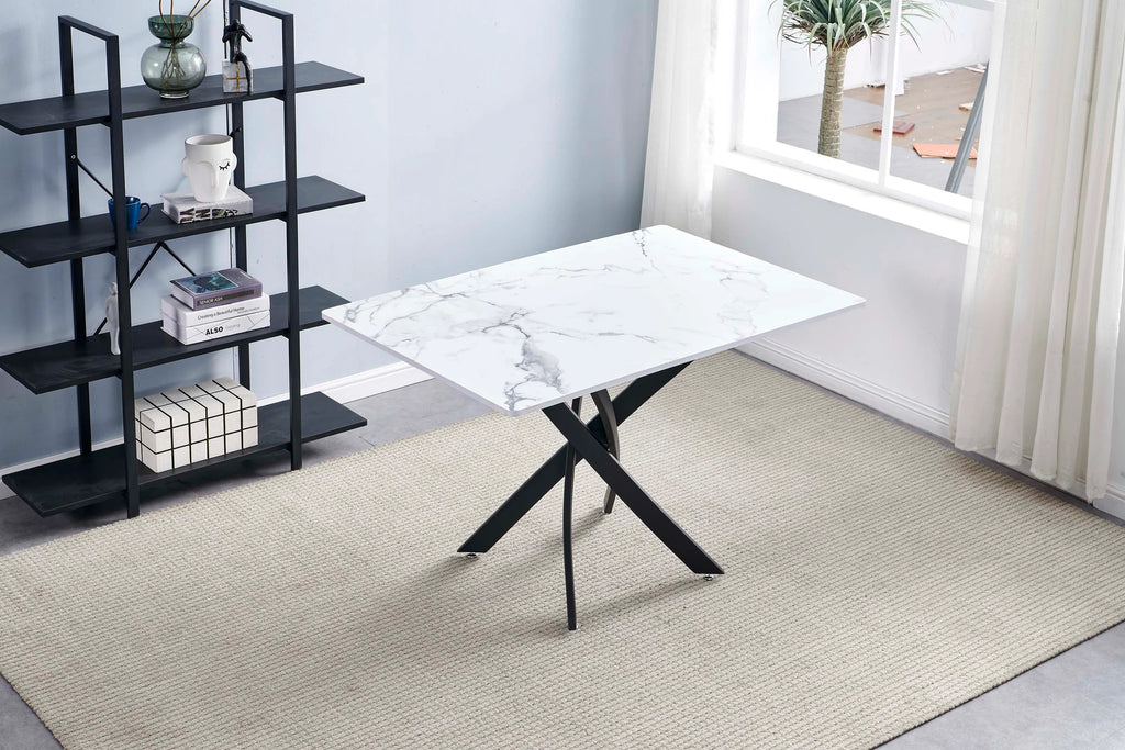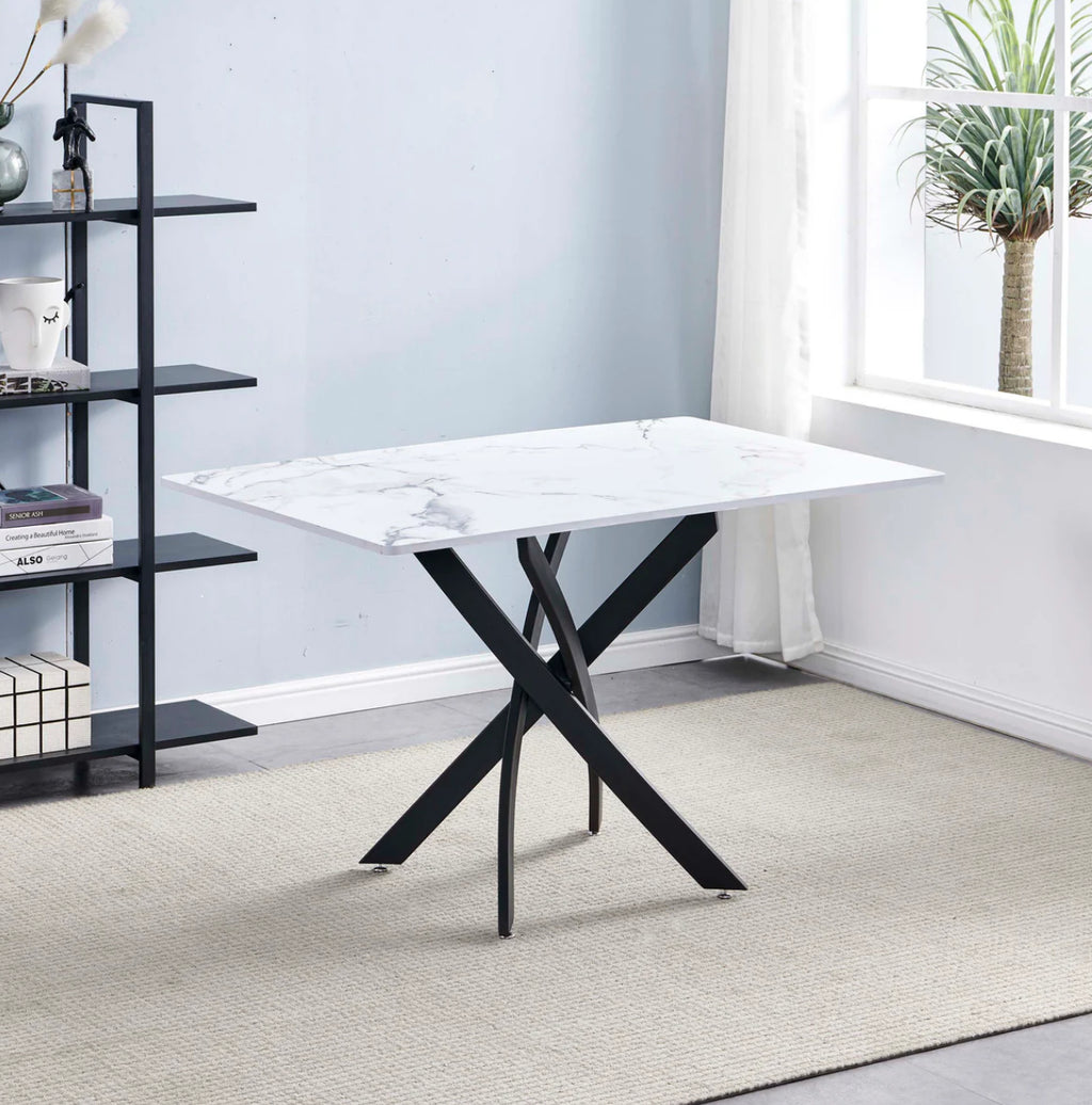 Elevate your dining experience with this elegant rectangular dining table, featuring a sturdy MDF and black metal base for a... Elevate your dining experience with this elegant rectangular dining table, featuring a sturdy MDF and black metal base for a modern touch. Choose a printed white marble top for a sleek, sophisticated finish. Ideal for both casual meals and formal gatherings, it offers a stylish centerpiece for your dining room. View more