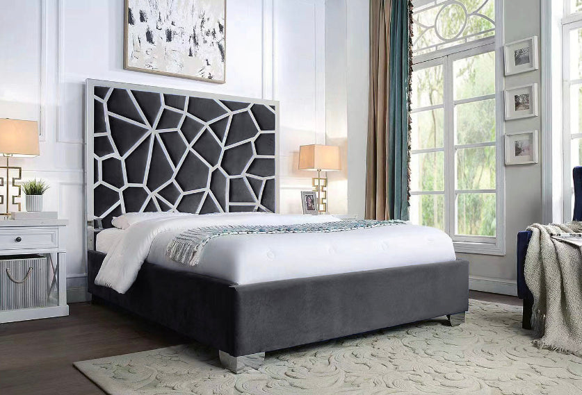 Make the Luxe Honey Comb king bed the center showpiece in your bedroom makeover. This elegant bed has a bold... Make the Luxe Honey Comb king bed the center showpiece in your bedroom makeover. This elegant bed has a bold look with its tall headboard that's divided up into honeycomb shapes for a slightly industrial feel. Chromed metal against the soft and durable grey adds a stunning feel to this bed. Finished and tailored presentation that turns heads and makes your bed the star of the show. View more