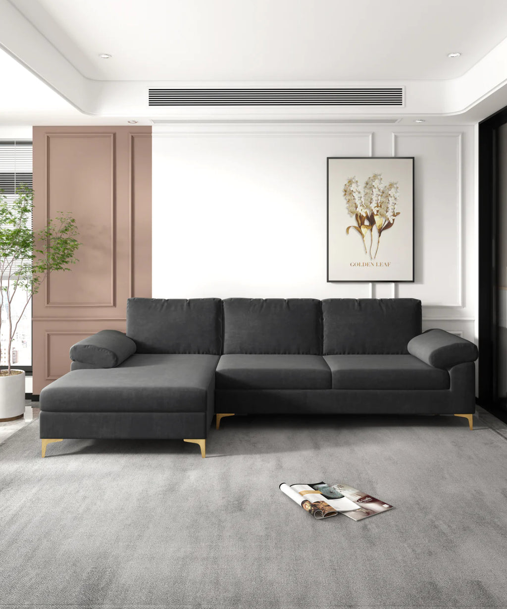 Indulge in the ultimate luxury with our Grey Velvet Sectional. Its sleek velvet upholstery is crafted from 100% polyester for... Indulge in the ultimate luxury with our Grey Velvet Sectional. Its sleek velvet upholstery is crafted from 100% polyester for superior comfort. The solid wood structure and high-density foam provide durability and support, while the pocket springs ensure ease of relaxation. The gold metal legs lend a luxurious aesthetic and complete the overall size of 101.6"Lx52"Dx32.3"H. Sink into chic luxury with our Grey Velvet Sectional. View more