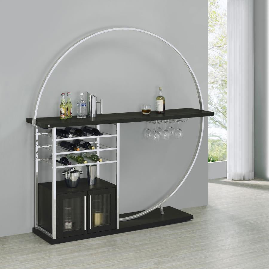 Transform your space into a beacon of style with this contemporary home bar that marries function with cutting-edge design. Bathed... Transform your space into a beacon of style with this contemporary home bar that marries function with cutting-edge design. Bathed in the glow of LED lighting with a choice of eight vibrant colors, this piece becomes the centerpiece of any entertainer's haven. The sleek chrome electroplated metal frame supports a durable composite wood tabletop, perfect for hosting an array of glasses and spirits. Below, a two-door cabinet conceals essentials, while three tiers cradle up to 21 bottles of your finest wine. With a built-in stemware rack, this bar doesn't just store your collection, it showcases it, making every occasion a toast-worthy affair. View more