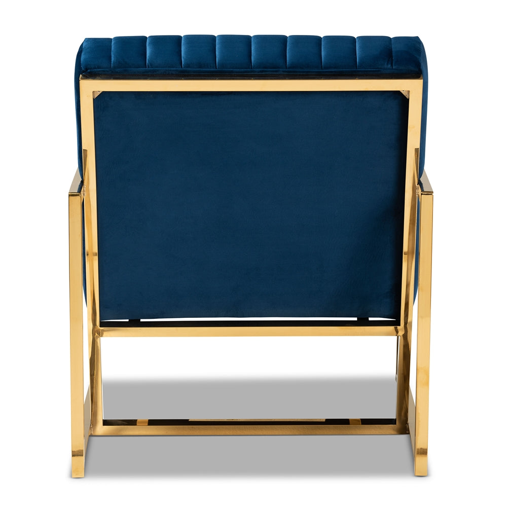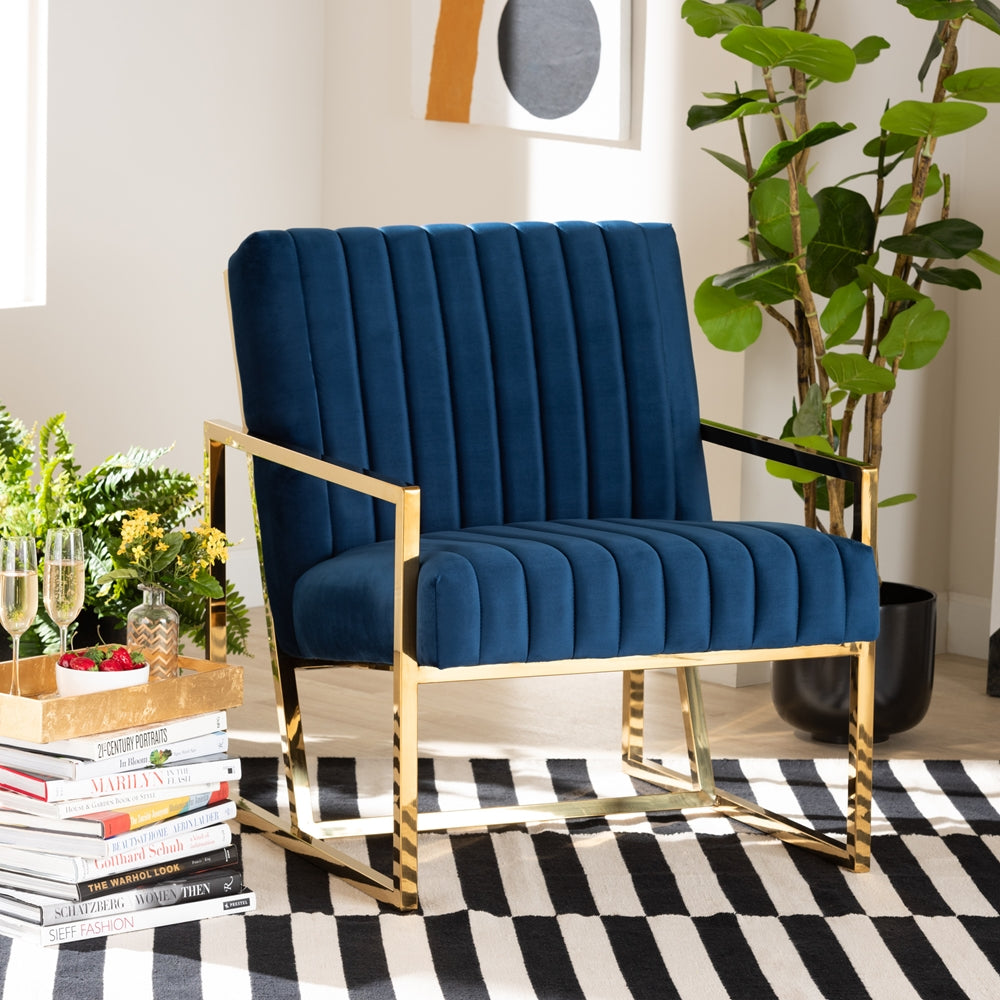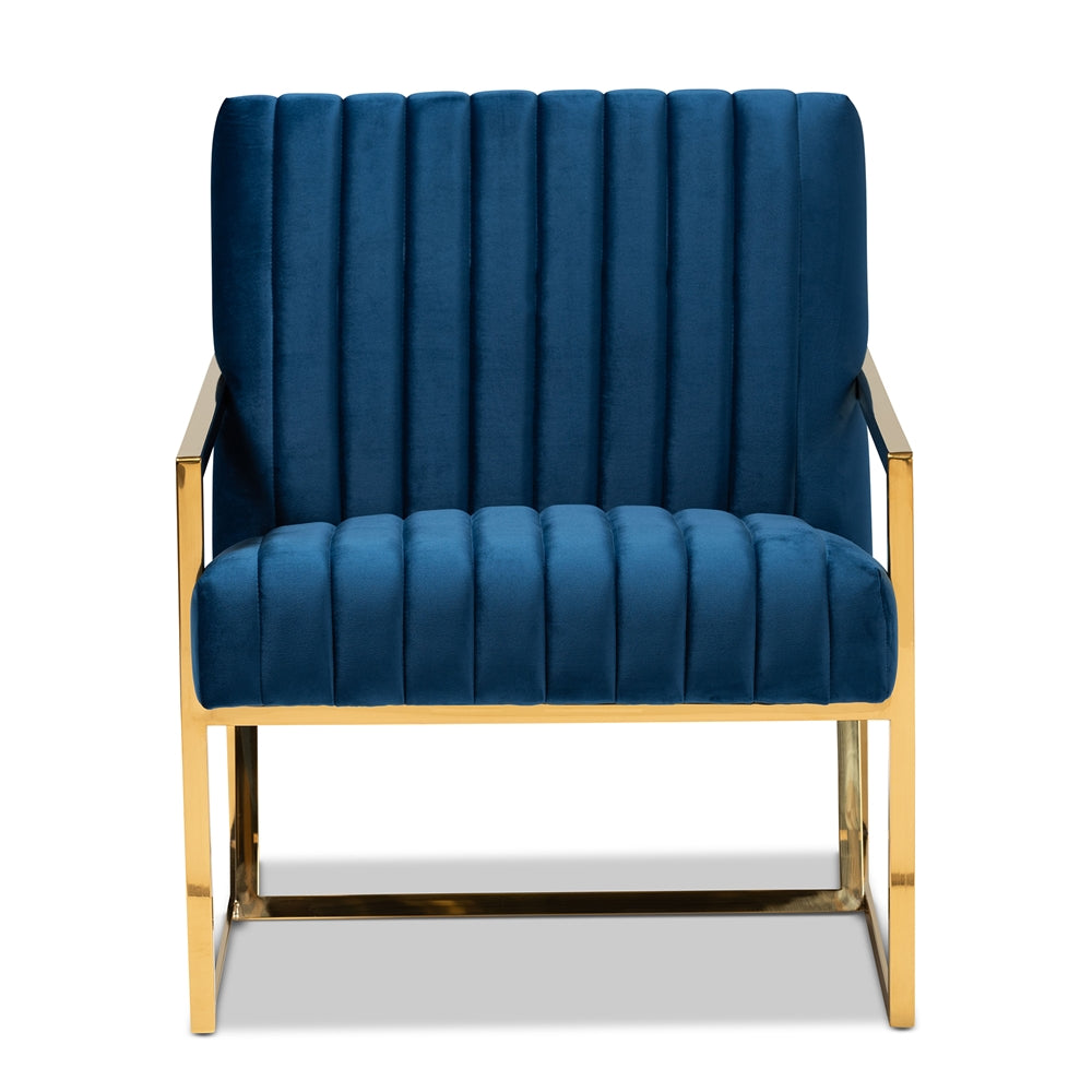 Lavish design meets modern comfort with the Janelle chair. Made in China, the Janelle is comprised of wooden frame padded... Lavish design meets modern comfort with the Janelle chair. Made in China, the Janelle is comprised of wooden frame padded with foam and upholstered in a stunning royal blue velvet fabric. Channel tufting highlights the striking tones in the velvet, while the gold-tone metal frame embodies pure glamour. Fully assembled, the angled backrest and solid armrests provide ample comfort. Dress up any living room or office with the opulence and utility of the Janelle chair. View more
