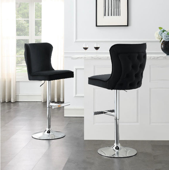 Modern finishes reinforce the contemporary aesthetic of this adjustable barstool. Featuring a height adjustable seat for easy, convenient adjustments to... Modern finishes reinforce the contemporary aesthetic of this adjustable barstool. Featuring a height adjustable seat for easy, convenient adjustments to best fit your space. Its seat is upholstered in black leatherette with horizontal stitching that adds depth and detail. A pedestal base features a square foot and a gleaming chrome finish. A T-shaped footrest is built in, offering easy relaxation for a quick bite or a leisurely night cap. View more